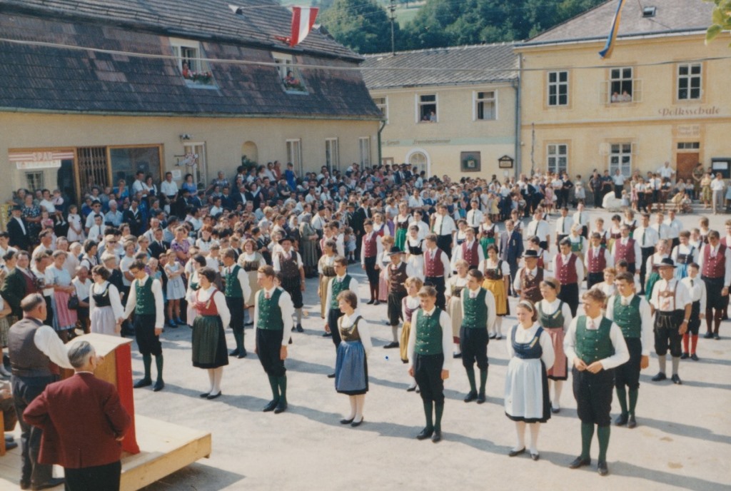 Nach dem Auftanz, der von allen Gruppen gemeinsam getanzt wurde, wurde die Trachtenkapelle Weikersdorfer von der Kapelle “ d‘ Berglandler “ aus Tradigist abgelöst, nun folgte die Begrüßung durch Bürgermeister Blamauer und Festansprachen von Herrn N.R. Kern und Professor Dr. Bammer.